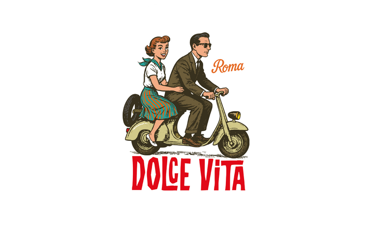 Dolce Vita celebra l’atmosfera romantica e spensierata della Roma anni ’60. Una grafica in stile vintage, simbolo di libertà, amore e avventura tra le strade della Città Eterna. La scritta “Dolce Vita” completa il design, richiamando il fascino immortale della capitale.