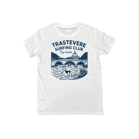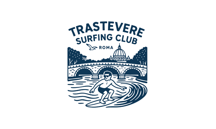 Trastevere Surfing Club nasce da un’idea ironica e surreale: fare surf sul fiume Tevere, proprio nel cuore di Roma. Una grafica divertente e creativa che unisce lo spirito libero del surf con l’atmosfera unica di Trastevere, trasformando il quartiere più autentico della Capitale in un club da sogno.