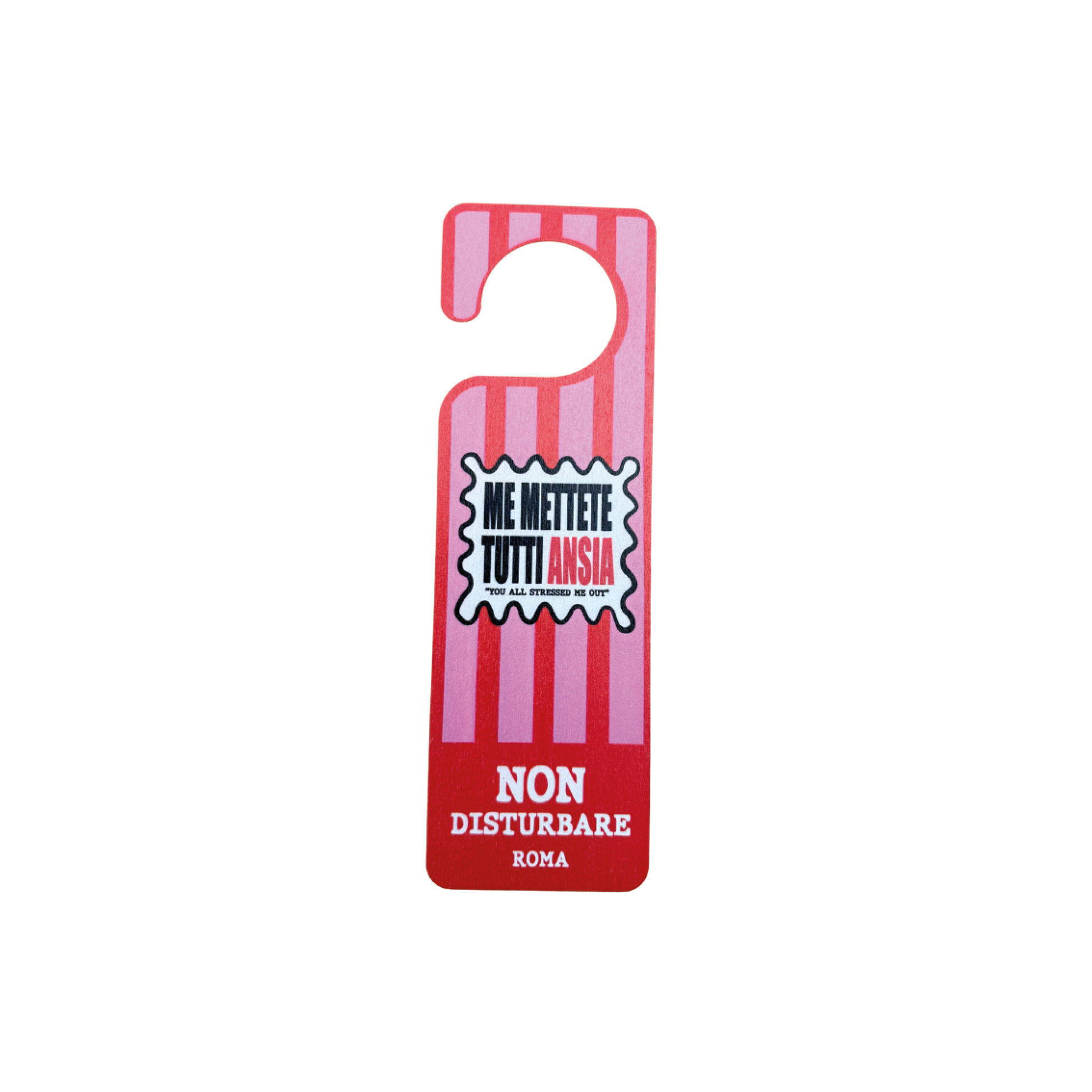 Con dimensioni 25x8 cm, sono perfetti da appendere fuori dalla porta per non essere disturbati, ma anche come idea regalo unica e ironica. I design originali MIBO celebrano Roma, il suo spirito irriverente e le espressioni tipiche della capitale, trasformando un accessorio quotidiano in un vero pezzo di artigianato romano.