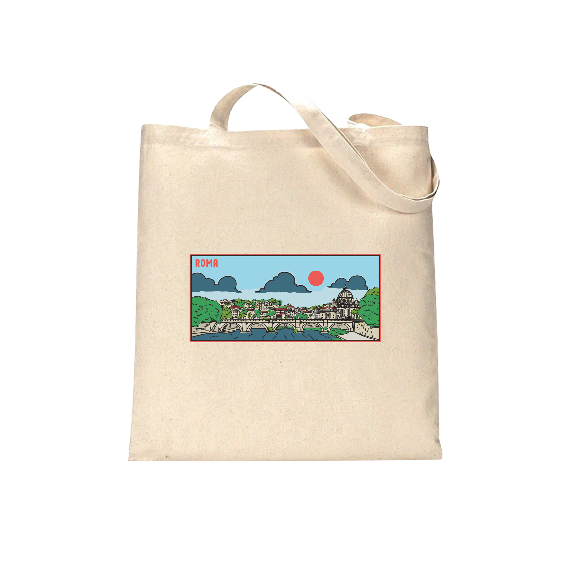 Ogni borsa viene stampata direttamente nel nostro store a Roma con i design originali MIBO: grafiche dedicate alla città eterna, alla sua storia, alle espressioni tipiche del dialetto romano e alla cucina tradizionale.